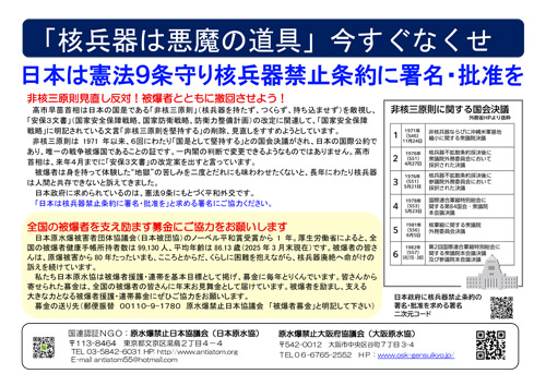 新「非核日本キャンペーン」は、TPNW(核兵器禁止条約)への日本の参加を掲げ、国民世論と共同の力で核兵器の廃絶と平和へ、これまでのとりくみをさらに発展させ、世界をリードするキャンペーンです。10月の国連総会の軍縮審議、来年1月のTPNW発効5周年、被災72年3・1ビキニデー、第11回NPT再検討会議(4月)、8月の原水爆禁止2026年世界大会、そして2026年11月、国連と核兵器廃絶を求める全世界の政府、市民社会の運動が協力してとりくむTPNW第1回再検討会議に向かって「非核日本キャンペーン」の新たなとりくみをただちに開始しましょう。
