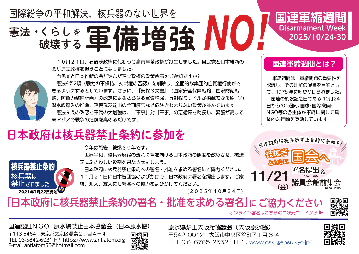 11月21日、私たちは、「日本政府に核兵器禁止条約への署名・批准を求める署名」を提出します。また国会前でも集会を開きます。被爆80年、平均年齢86才を超えた被爆者のみなさんの証言、核兵器廃絶を願う声は、人類全体の声に他なりません。核兵器が何をもたらすのか、被爆者が経験したその地獄は、絶対に繰り返してはならないものです。核兵器禁止 条約に日本も署名し批准する、その決断を迫りましょう。